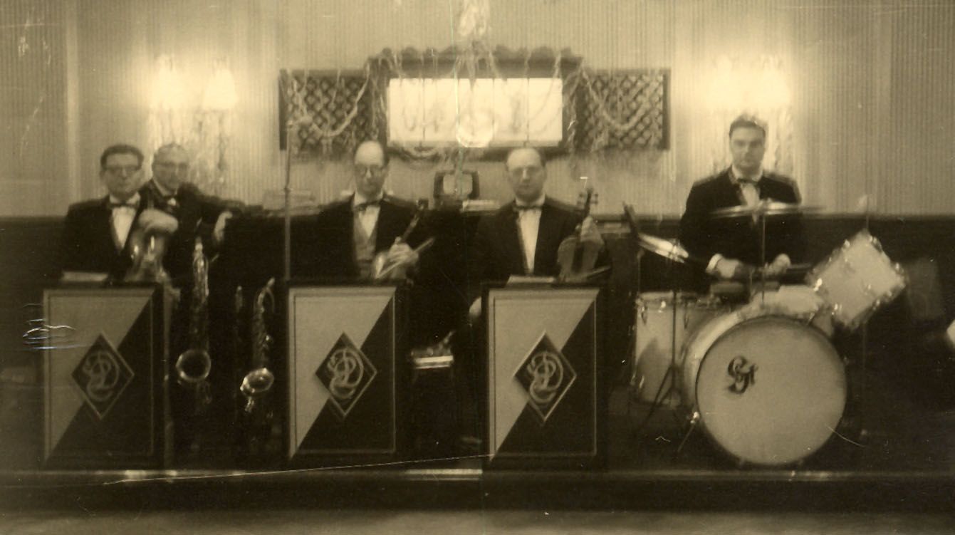 v.l.: Schmidt - Geige und Tenorsaxophon, Eberhard Drommel - Piano, Heinz Braune - Geige und Altsaxophon, Alfred Lischkeit - Geige und Trompete, Seppel Stülb - Schlagzeug