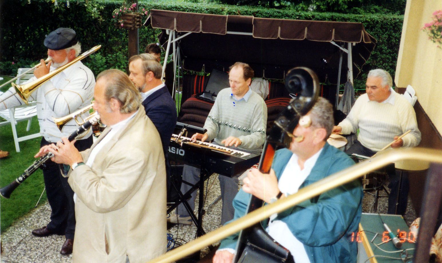 v.l.: Waikinat - Posaune, Eduard Bock - Klarinette, Charly Boelmann - Trompete, Arno Lindemann - Piano, Hüsig - Kontrabass, Seppel Stülb - Schlagzeug