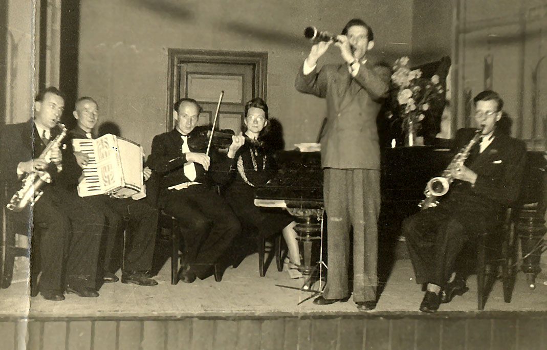 v.l.: ?? - Tenorsaxophon, Willi Seiler - Akkordeon, Herbert Gagsch - Geige und Altsaxophon, Gertrud Stülb - Piano,
